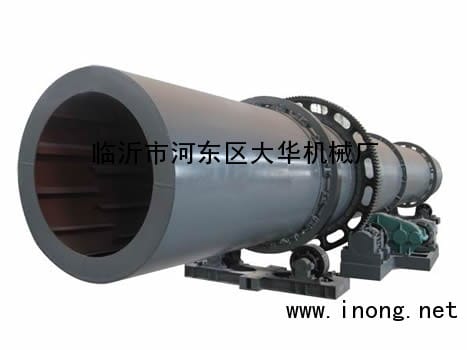 滚筒烘干机的主体部分为一个与水平线略呈倾斜的旋转圆筒。圆筒由齿轮传动,转速一般为2~6r/min,圆筒的倾斜度与其长度有关,通常介于1°~5°之间。物料从转筒较高的一段送入,与热空气接触,随着圆筒的旋转,物料在重力的作用下流向较低的一端被干燥而排出。由于干燥机处于负压条件下工作,进料及排料端均采用密封装置以免漏风。