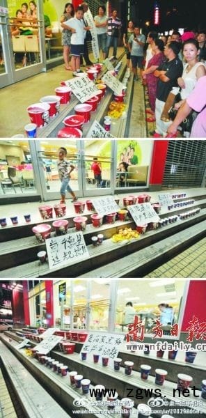 事件发生在位于该市京汉大道的肯德基汽车穿梭餐厅。前日下午4时许,记者赶到现场时,当事肯德基店门前已经放置了22份肯德基外带全家桶,整齐摆放在门口台阶上。一同摆放的,还有几块手书的“肯德基操作违规、肯德基卫生安全有问题”的纸牌子(如右图,网络图片)。