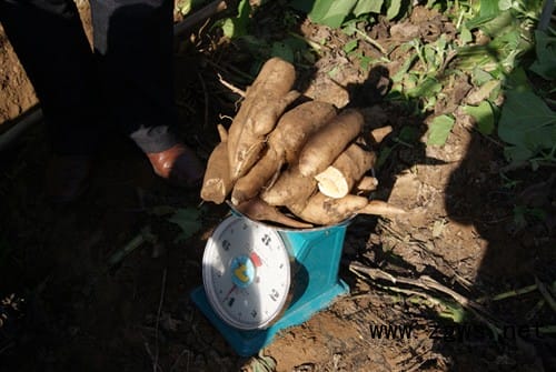 10月31日,在宁陕县城关镇朱家嘴村小堰组看到,村民邹延琴正在自家的地头采收雪莲果,县农技中心的技术人员现场进行测产。只见几锄下地,一窝雪莲果便整兜挖了出来。经称重,每窝5至10斤不等,亩产接近万斤,其产量比种红苕还高,村民喜上眉梢。