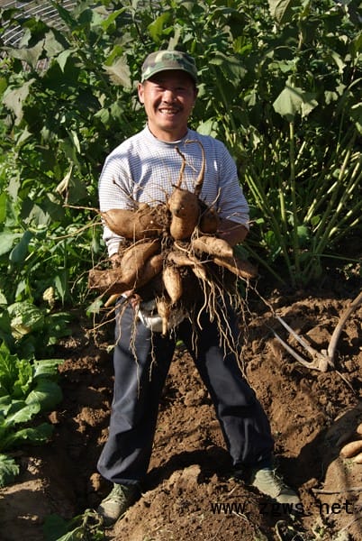雪莲果原产自南美洲的安第斯山脉,集药、果、菜三位一体,含钙、铁、硒等20多种微量元素,是一种新兴的珍奇水果,具有调理血液、帮助消化、去火解毒等功效。其叶片可制茶叶,茎杆可制作优质饲料,具有很高的营养价值和经济价值。